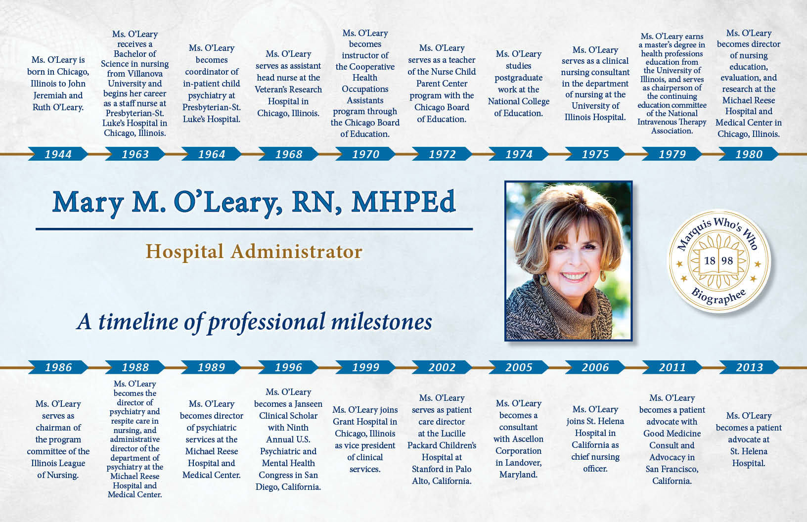 Ms. O’Leary receives a Bachelor of Science in nursing from Villanova University and begins her career as a staff nurse at Presbyterian-St. Luke’s Hospital in Chicago, Illinois.