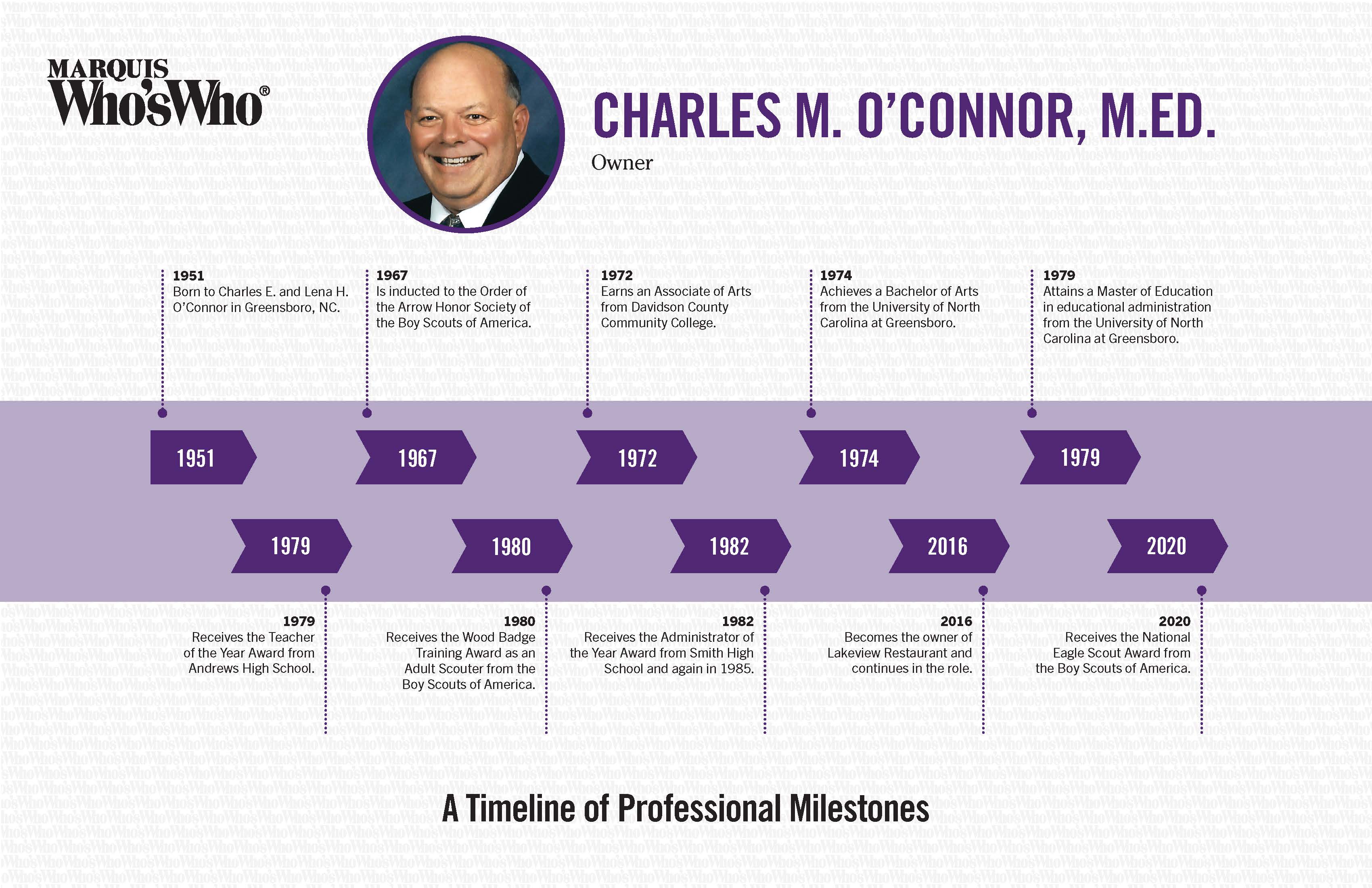 Attains a Master of Education in educational administration from the University of North Carolina at Greensboro.