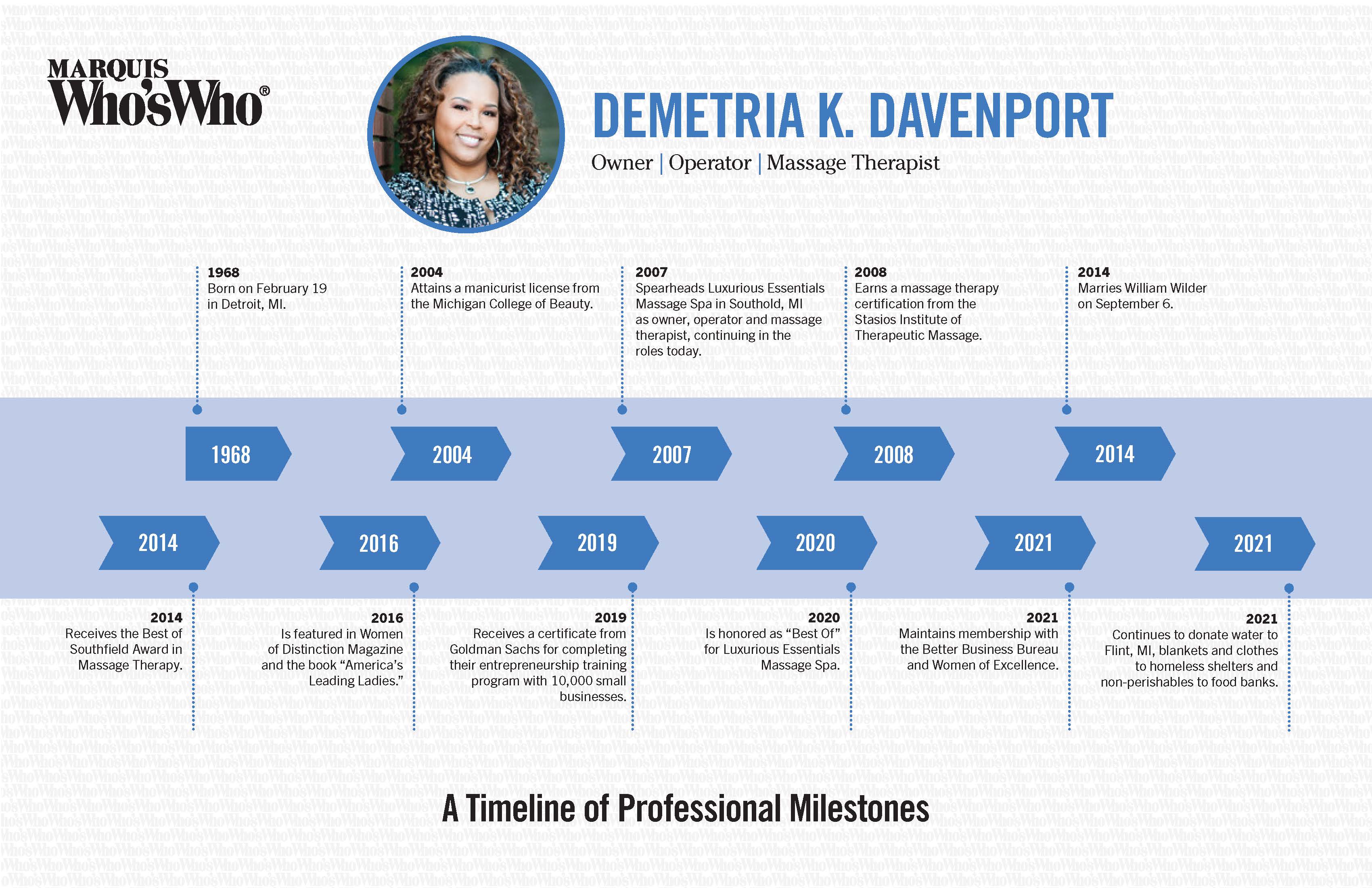 Spearheads Luxurious Essentials Massage Spa in Southfield, MI as owner, operator and massage therapist, continuing in the roles today.