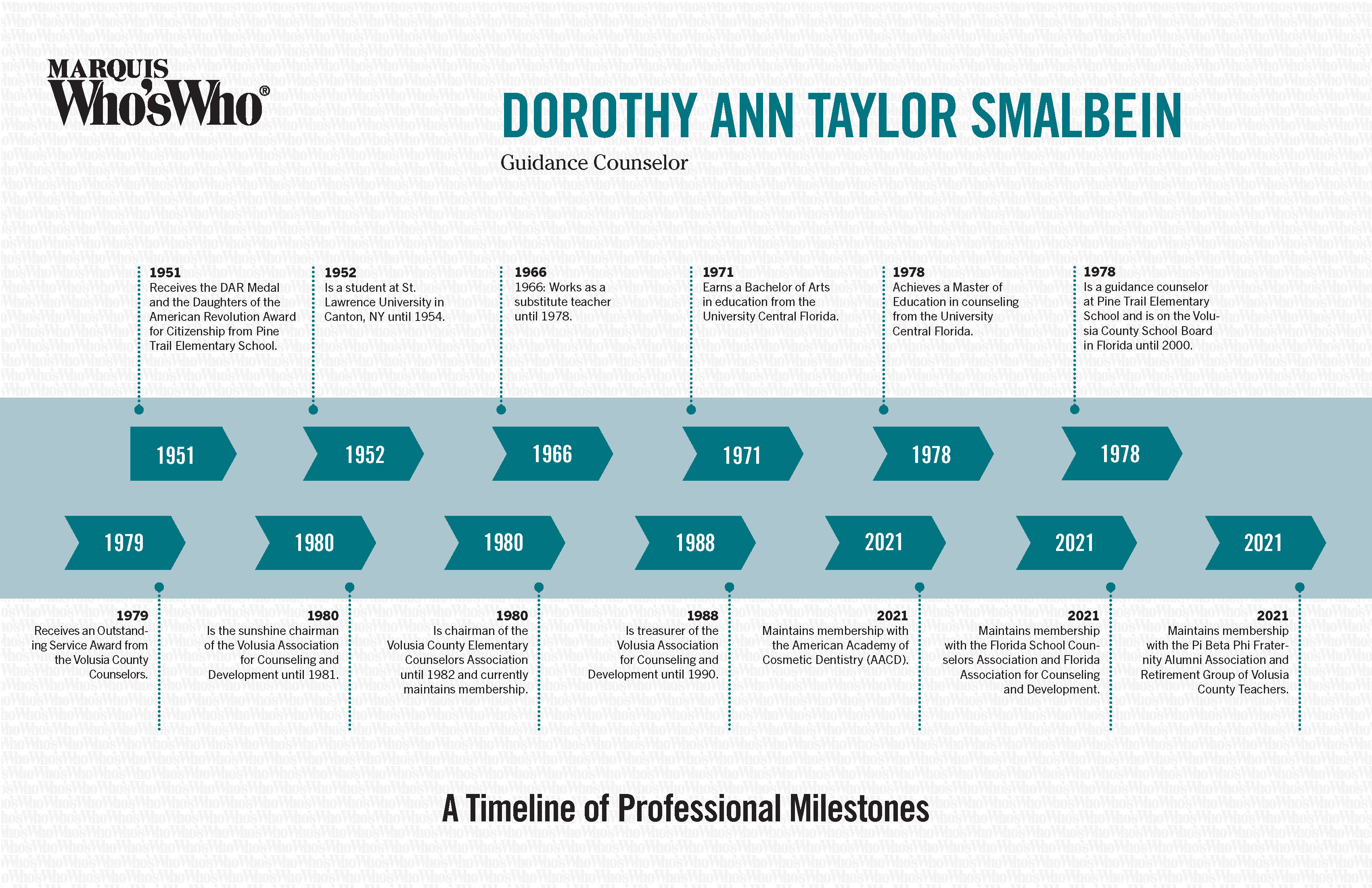 Is chairman of the Volusia County Elementary Counselors Association until 1982 and currently maintains membership.