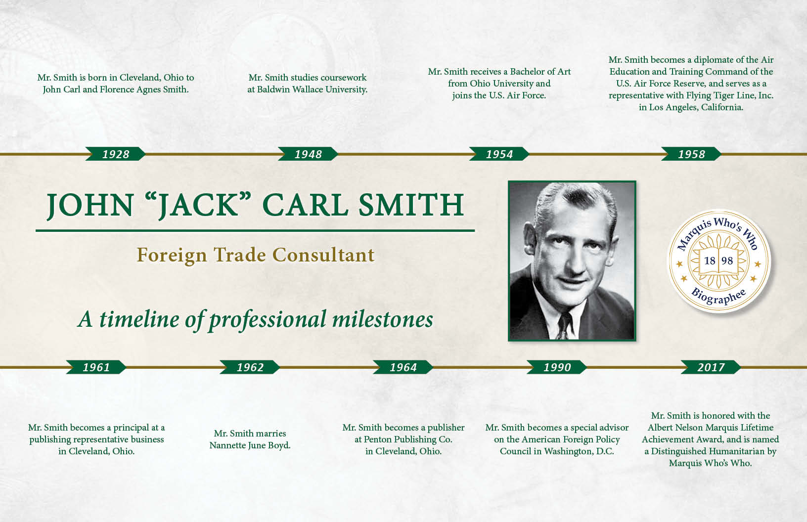 Mr. Smith is born in Cleveland, Ohio to John Carl and Florence Agnes Smith.