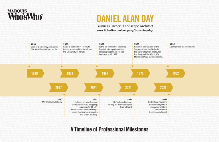 1939 Born to Daniel Day and Zaida Blackwell Day in Kokomo, IN. 1963 Earns a Bachelor of Fine Arts in landscape architecture from the University