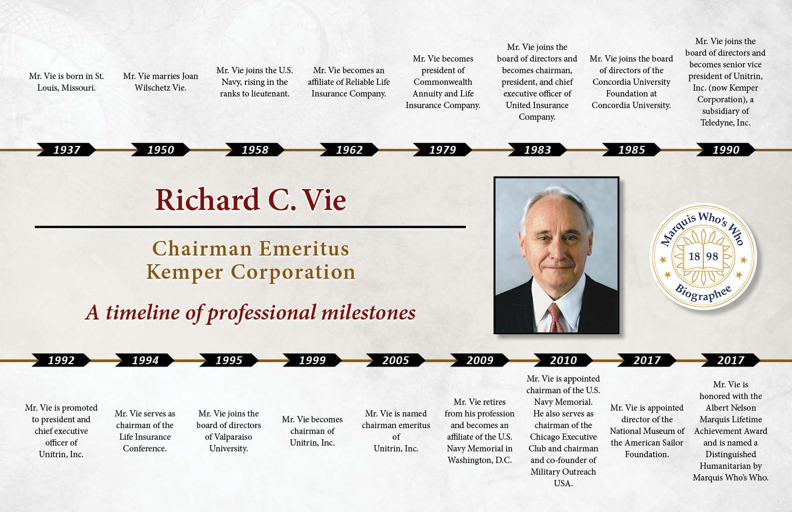 Mr. Vie is appointed chairman of the U.S. Navy Memorial. He also serves as chairman of the Chicago Executive Club and chairman and co-founder of Military Outreach USA.
