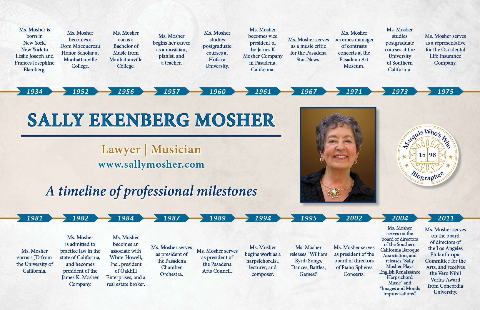 Ms. Mosher serves on the board of directors of the Southern California Baroque Association, and releases “Sally Mosher Plays English Renaissance Harpsichord Music” and “Images and Moods Improvisations.”