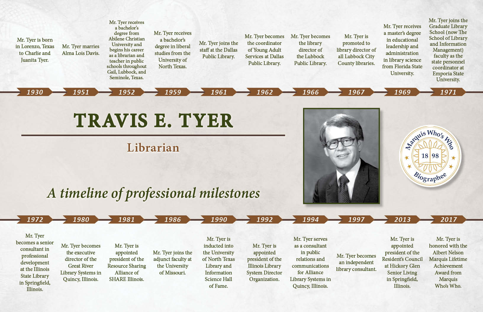 Mr. Tyer receives a bachelor’s degree from Abilene Christian University and begins his career as a librarian and teacher in public schools throughout Gail, Lubbock, and Seminole, Texas.