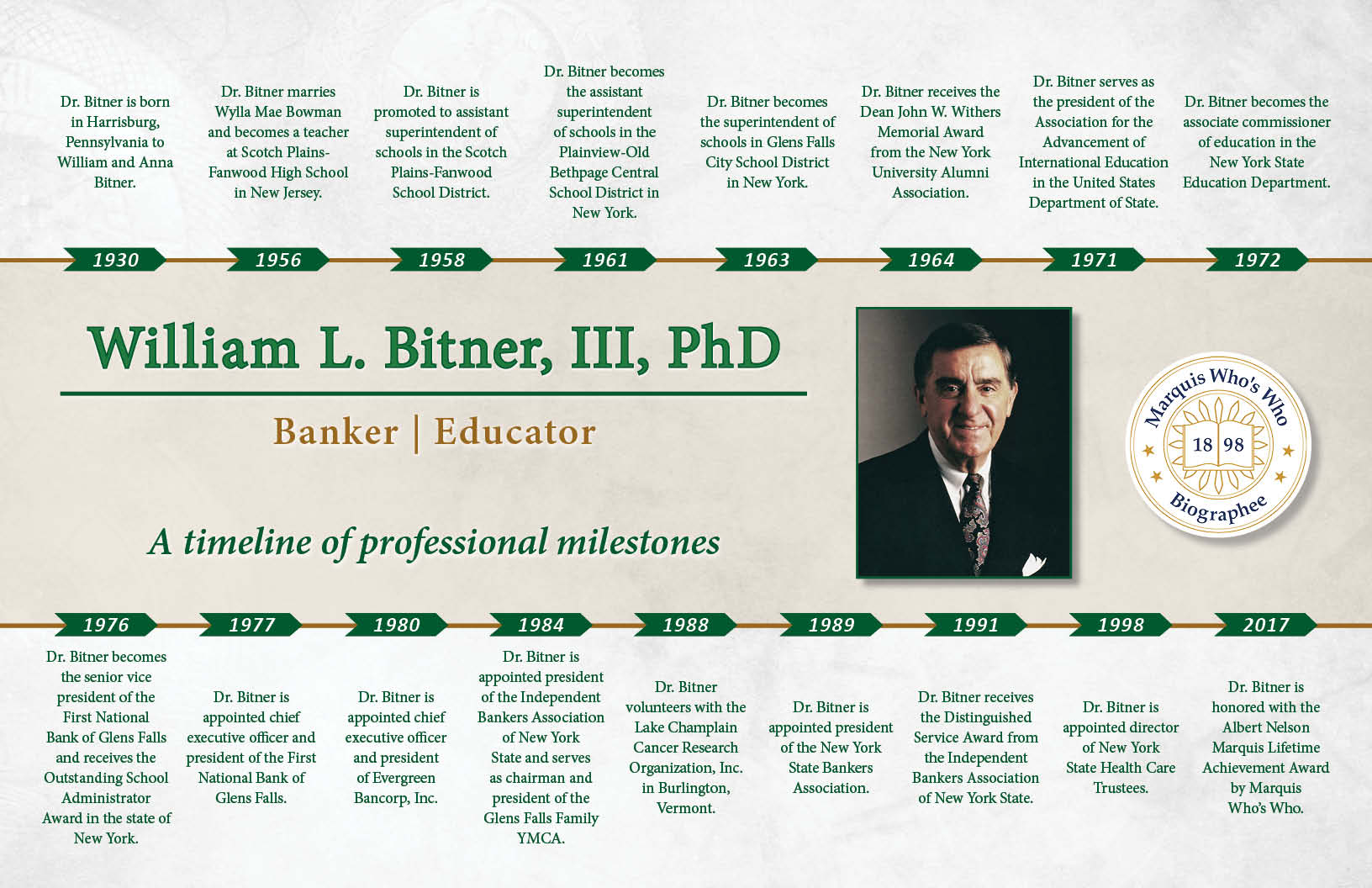 Dr. Bitner becomes the senior vice president of the First National Bank of Glens Falls and receives the Outstanding School Administrator Award in the state of New York.