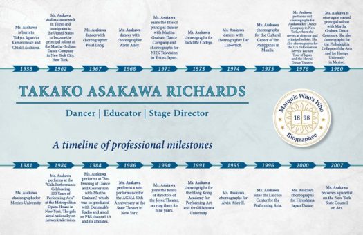 1938 Ms. Asakawa is born in Tokyo, Japan to Kamenosuke and Chiaki Asakawa. 1962 Ms. Asakawa studies coursework in Tokyo and immigrates to the United